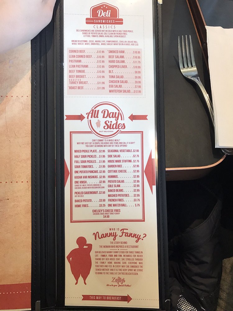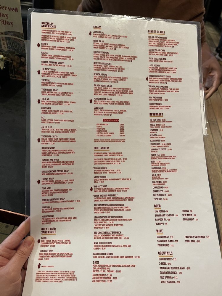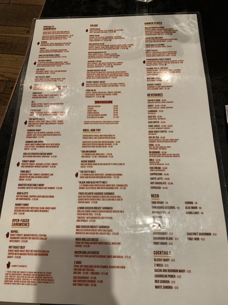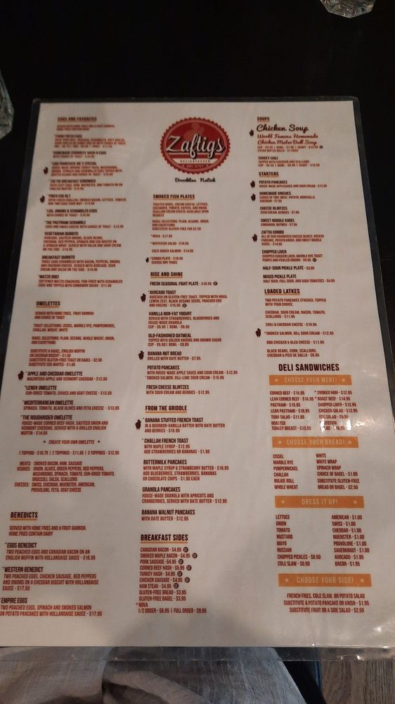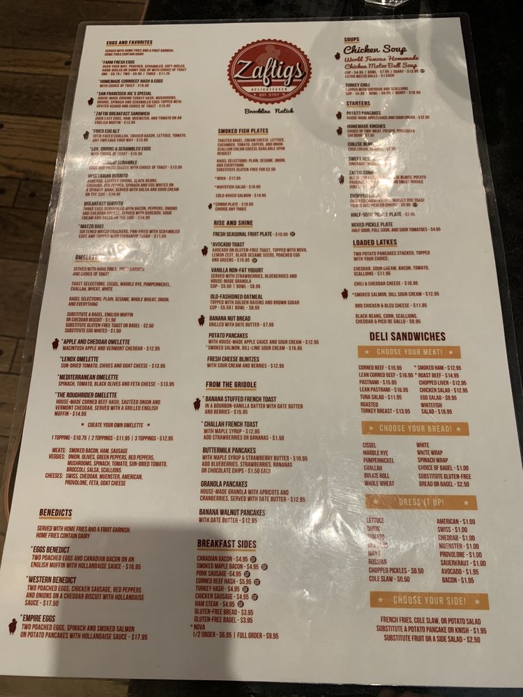 Introducing the menu at Zaftigs Delicatessen - Brookline, a classic Jewish deli with a modern twist. Starters like Bagel Chips with Herb Cream Cheese and Chopped Liver set the stage for a delicious meal. Salads like the BBQ Chicken Salad and Chicken Caesar Salad offer fresh and flavorful options. The Soups, including the famous Chicken Matzo Ball Soup, will warm you up on a cold day. Don't miss out on the Turkey Chili Soup topped with cheddar and scallions. Customer reviews rave about the cozy atmosphere, great service, and must-try dishes like the pastrami and kugel. Overall, Zaftigs Delicatessen - Brookline is a go-to spot for comfort food with a Jewish flair.